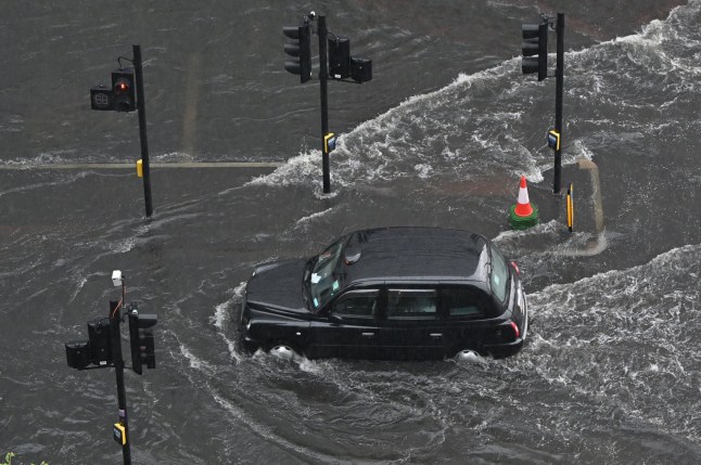 A London taxi drives through water on a flooded road in The Nine Elms district of London on July 25,2021 (Picture: Getty)