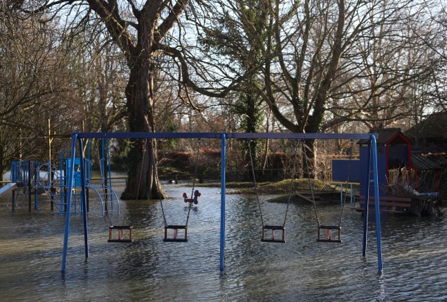 Floodwater surrounds swings and play equipment in a flooded children’s park in Wraysbury,west of London on January 9,2024,following Storm Henk (Picture: Getty)