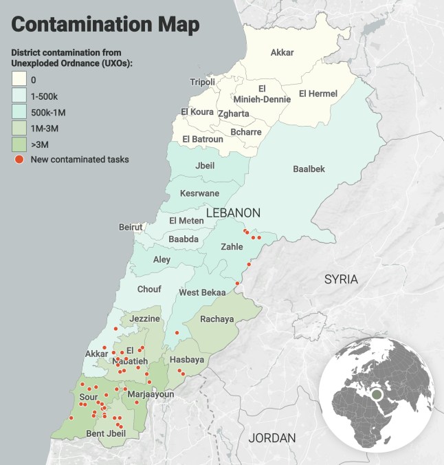 He says: ‘Returning to Kfarmelki was not easy and to this day,many people fear accessing their lands [because of UXOs].